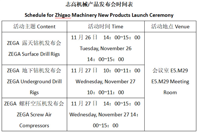 26號和27號,志高將在E5.M29會議室舉辦3場產(chǎn)品發(fā)布會,詳細(xì)介紹公司的露天鉆機、地下鉆機以及空壓機產(chǎn)品。在被展廳里的龐大機械吸引目光的同時,您還可以來會議室參加它的發(fā)布會,詳細(xì)了解它龐大身軀下的出色能力。帶有自動集中潤滑系統(tǒng)的ZEGA D490A、反循環(huán)勘探鉆機ZEGA D480RC、露天一體式牙輪鉆機ZEGA R8100……聽聽產(chǎn)品的性能和配置介紹,或許它比外型更能打動你。2024年11月26日至29日,我們在上海新國際博覽中心E5.511展位等你!